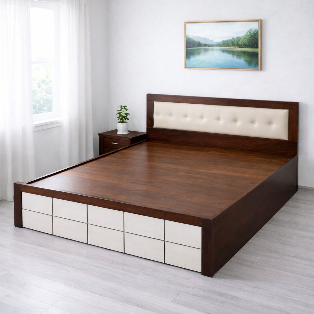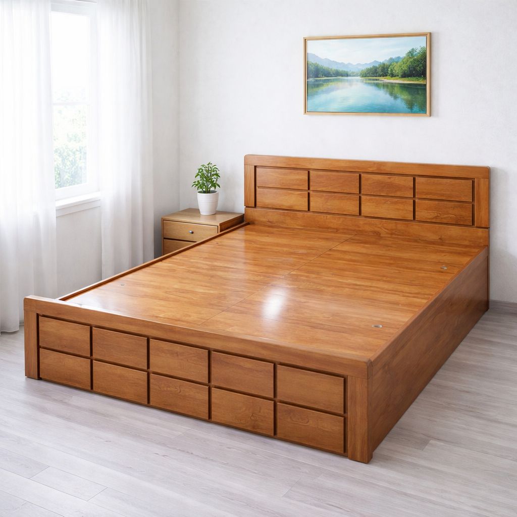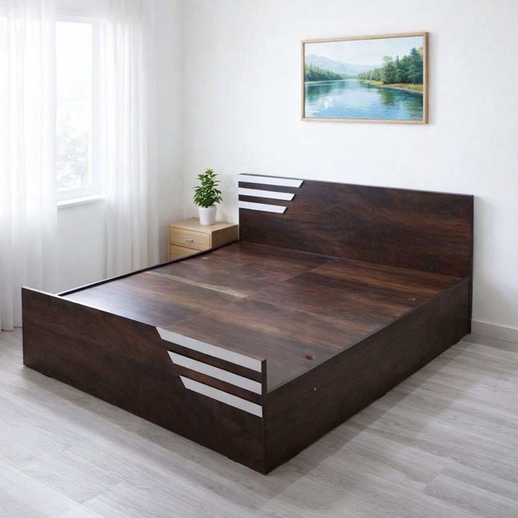 Elegant queen-size wooden bed with a rich, natural finish and modern panel design. Additional Info: Material: Engineered Wood Type: Non - Storage Dimension: 6ft L * 5ft B * 15 ft H